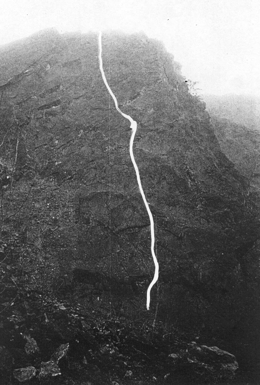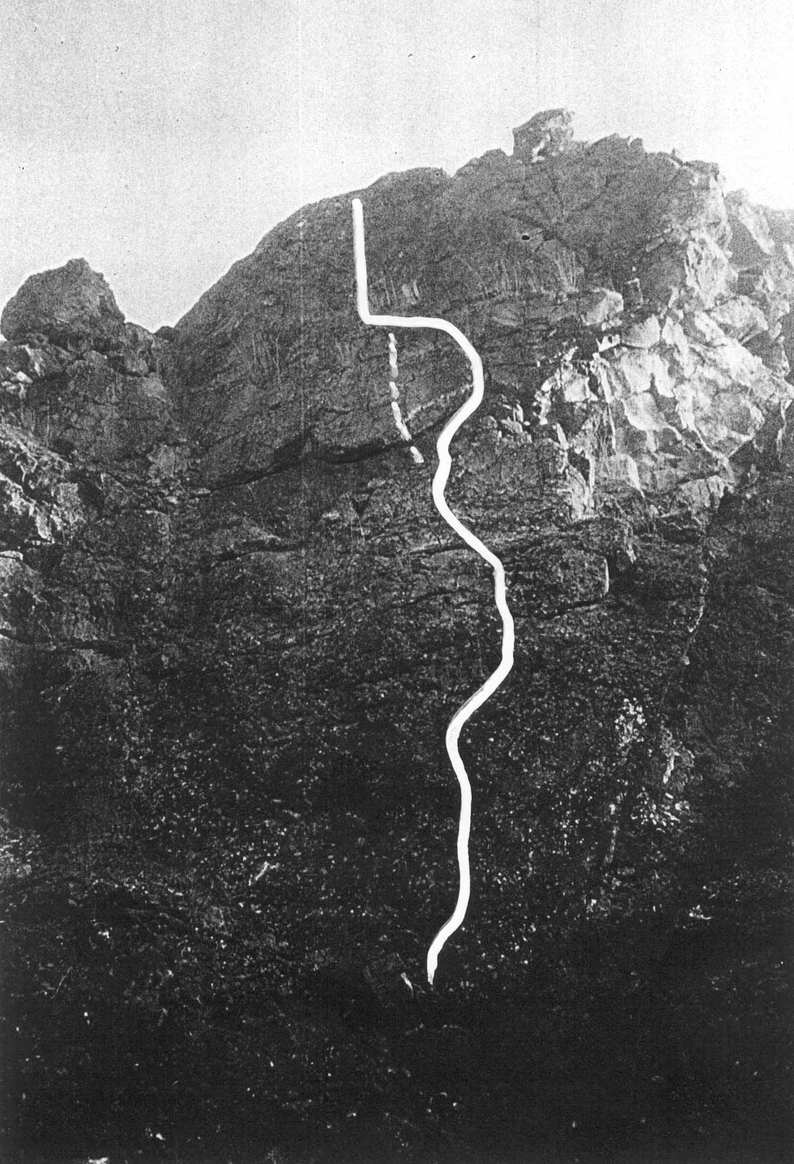 Climb west facing corner to overlap, 40'. Surmount this continuing up to the top on thin crack line