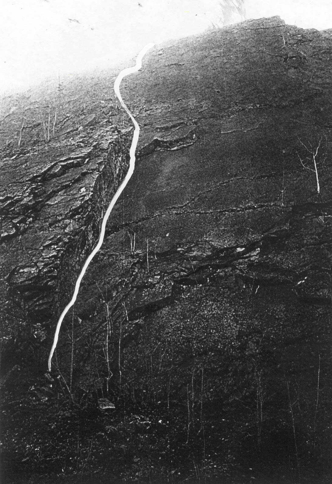40m up slope from Balch's slide opposite large bolder on track. Climb large crack on right of slab for 20' then either continue up right side of overlap and move left to gain centre crack on slab to grassy ledge, or take crack up centre of overlap 4c to gain same ledge. Continue to top on left crack